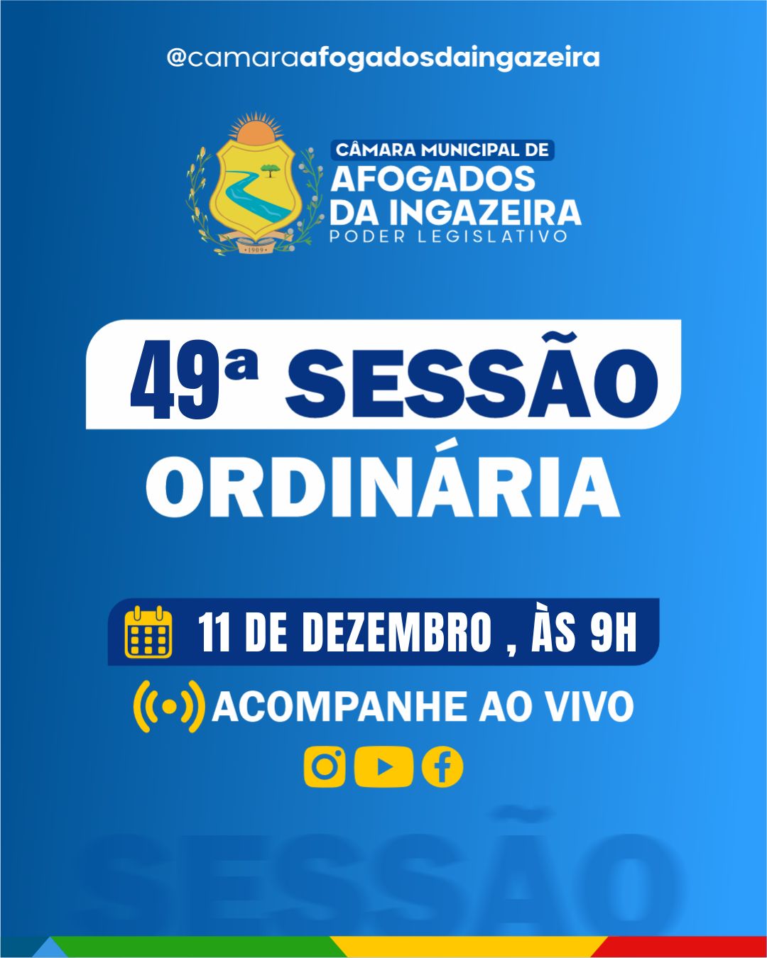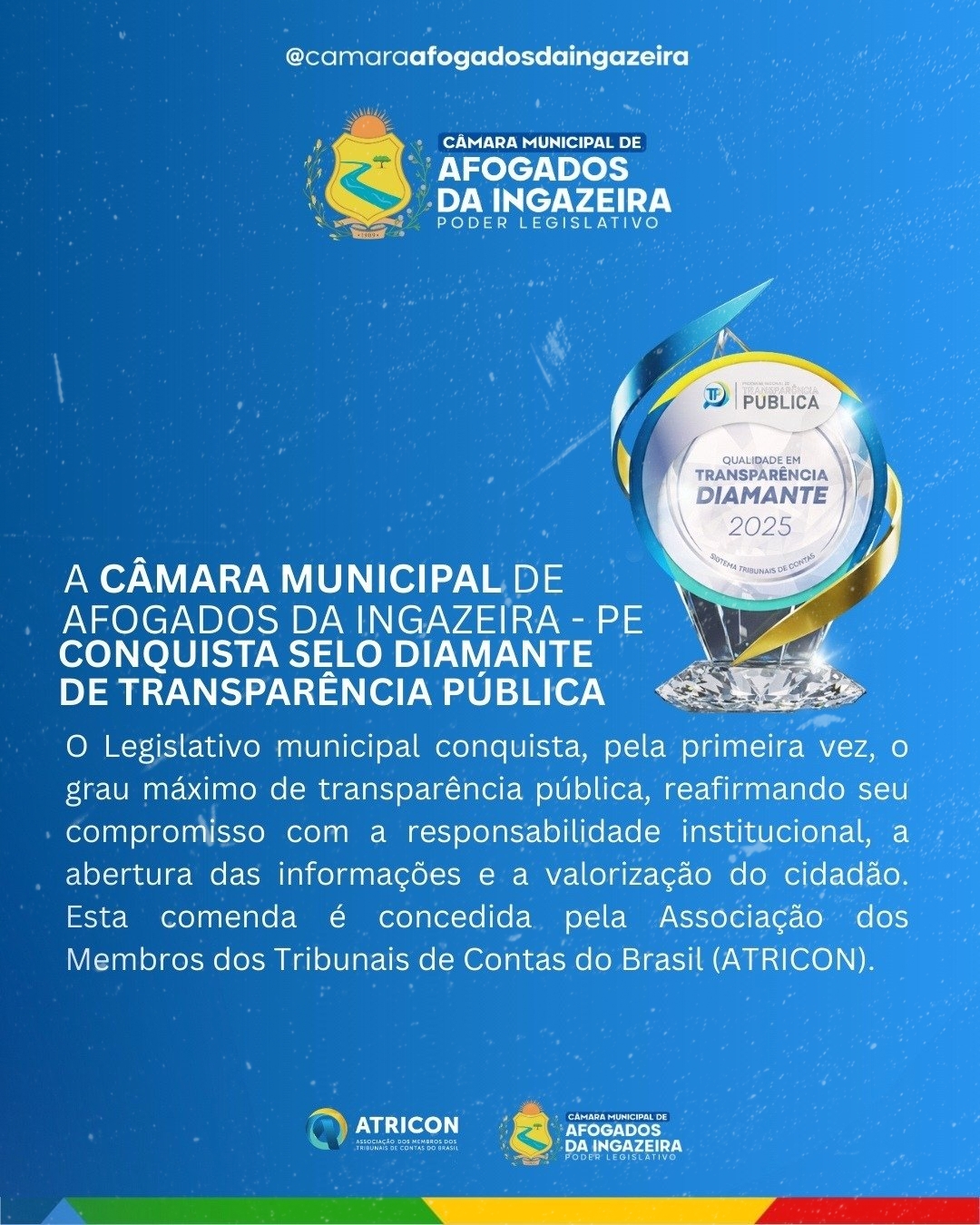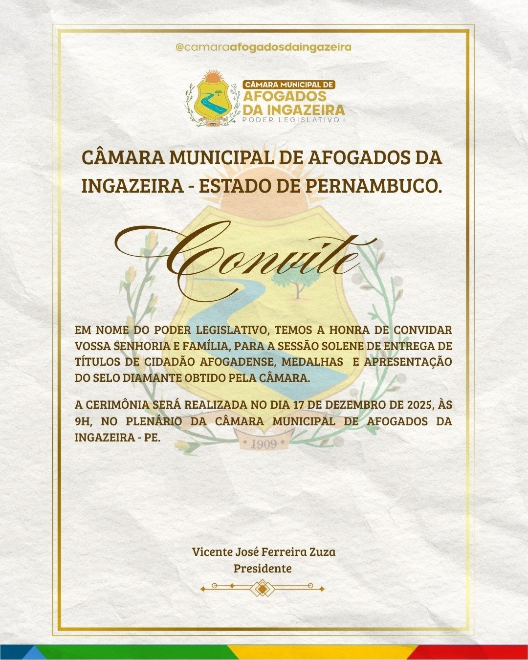 EM NOME DO PODER LEGISLATIVO, TEMOS A HONRA DE CONVIDAR VOSSA SENHORIA E FAMÍLIA, PARA A SESSÃO SOLENE DA ENTREGA DE TÍTULO DE CIDADÃO AFOGADENSE, MEDALHAS E APRESENTAÇÃO DO SELO DIAMANTE OBTIDO PELA CÂMARA. A CERIMÔNIA SERÁ REALIZADA NO DIA 17 DE DEZEMBRO DE 2025, ÀS 9H, NO PLENÁRIO DA CÂMARA MUNICIPAL DE AFOGADOS DA INGAZEIRA – PE.