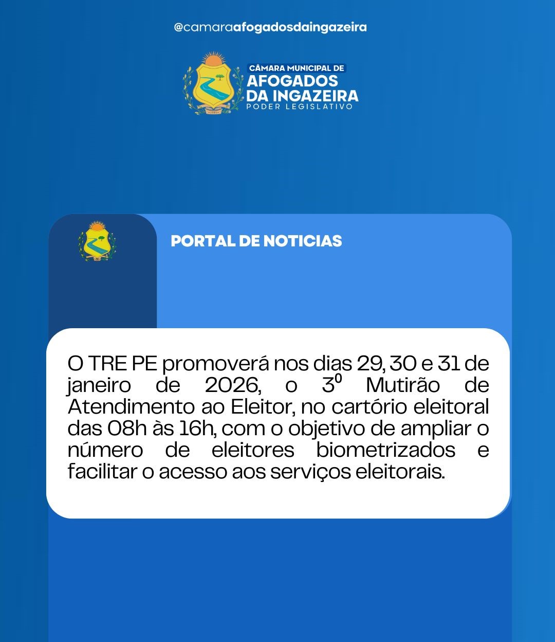 O TRE PE promoverá nos dias 29, 30 e 31 de janeiro de 2026, o 3⁰ Mutirão de Atendimento ao Eleitor, no cartório eleitoral das 08h às 16h, com o objetivo de ampliar o número de eleitores biometrizados e facilitar o acesso aos serviços eleitorais.