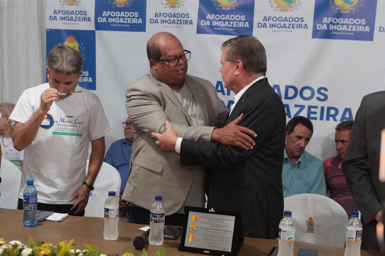 O Presidente Vicentinho por ocasião da solenidade da entrega dos títulos de propriedade aos moradores no Conjunto Residencial Laura Ramos e do título de Cidadão Honorário ao Desembargador Ricardo de Oliveira Paes Barreto, ladeado pelo Prefeito Sandrinho e o homenageado.