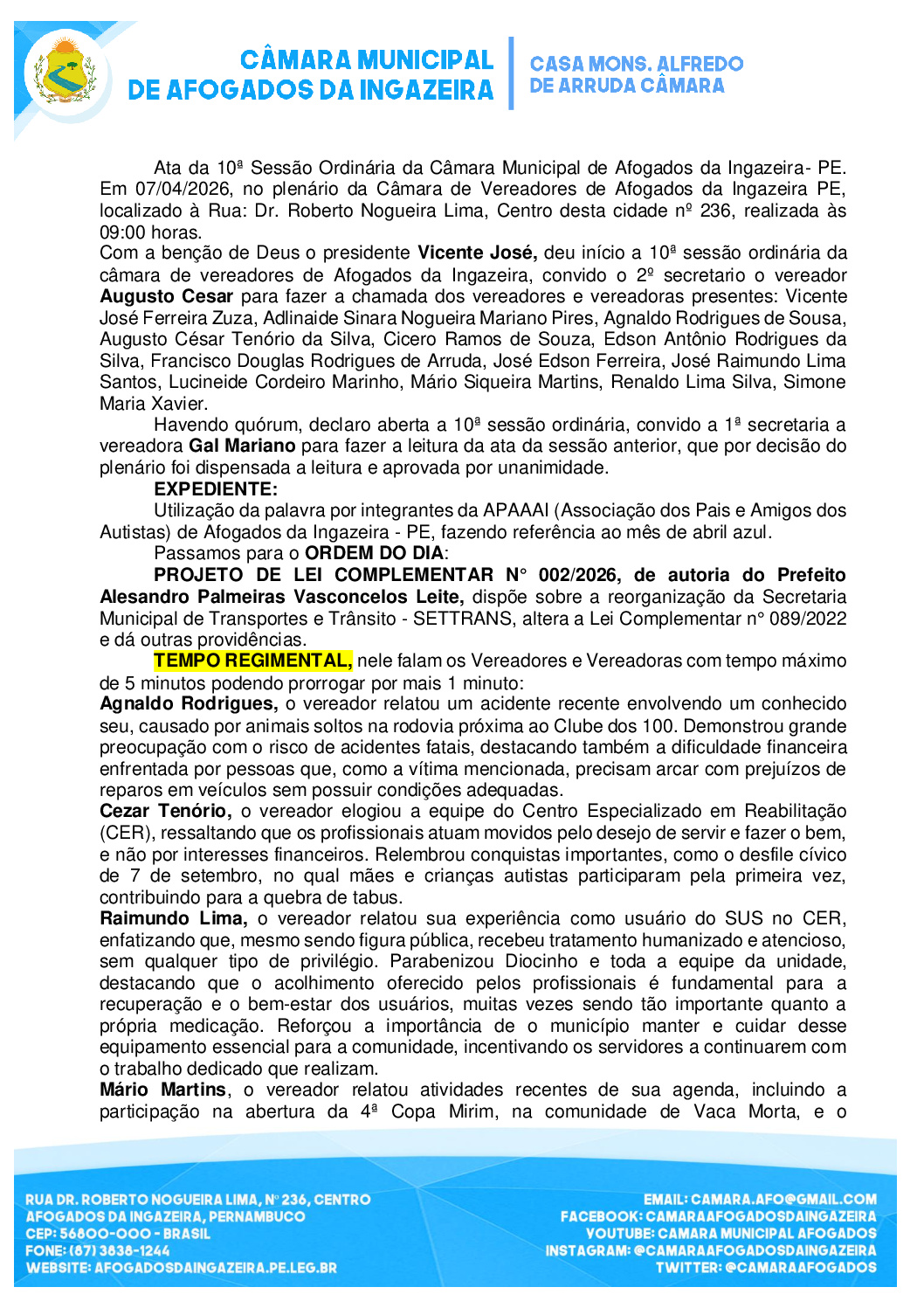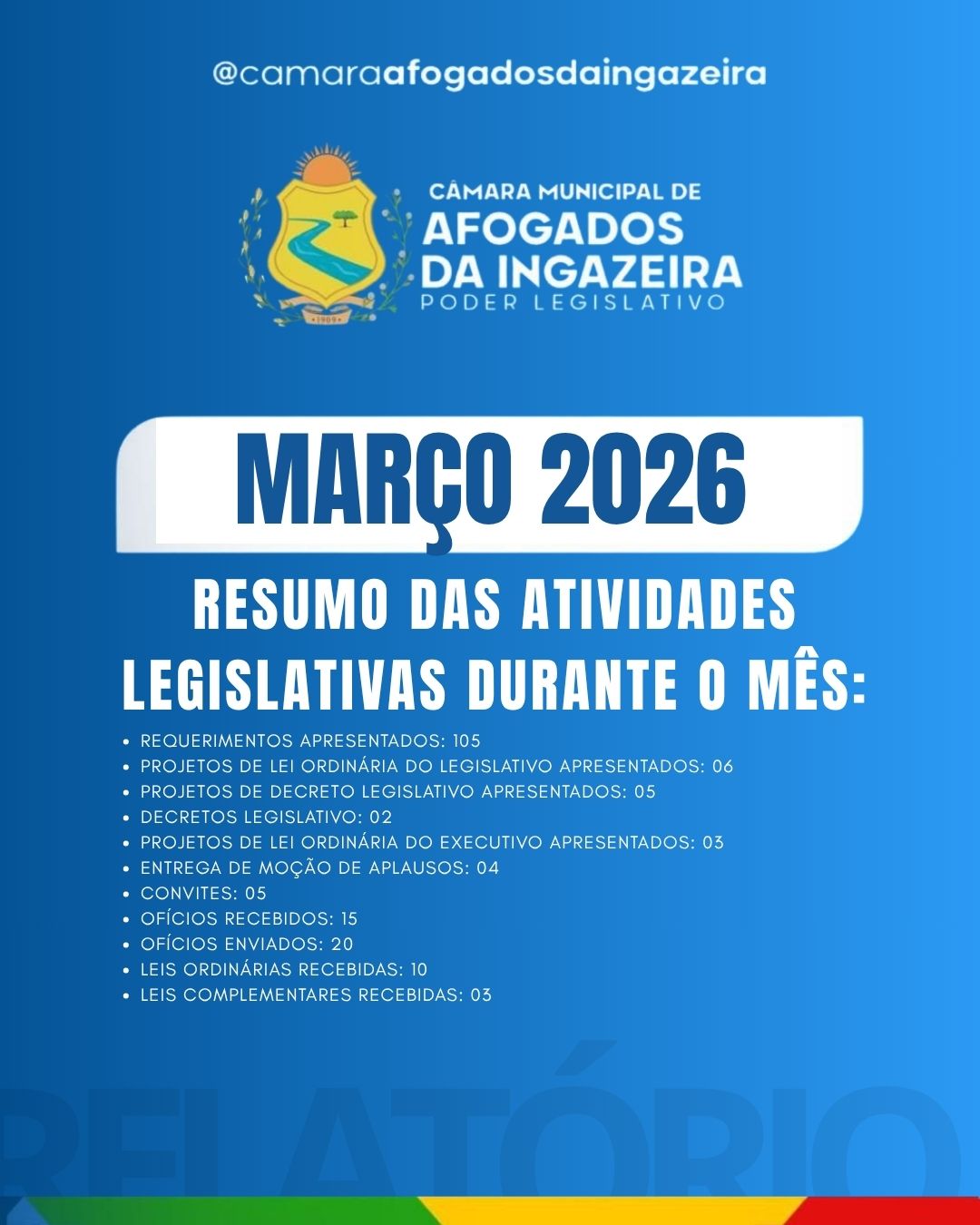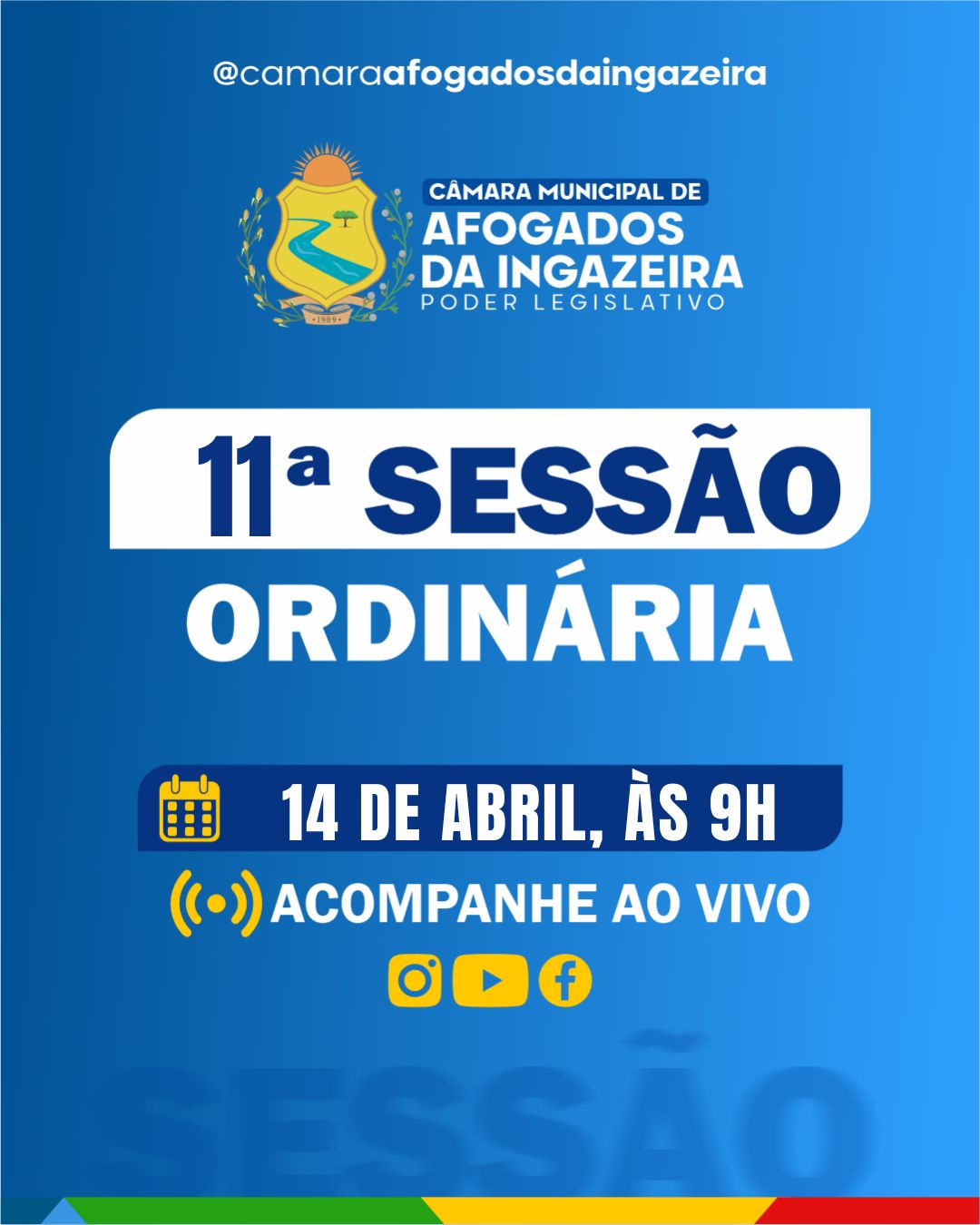 A Câmara municipal de Afogados da Ingazeira, nesta data de 14 de abril de 2026, realizou a sua 11ª Sessão Ordinária objetivando discutir os Projetos de Lei em tramitação e vários requerimentos, matérias que constam no portal da transparência.