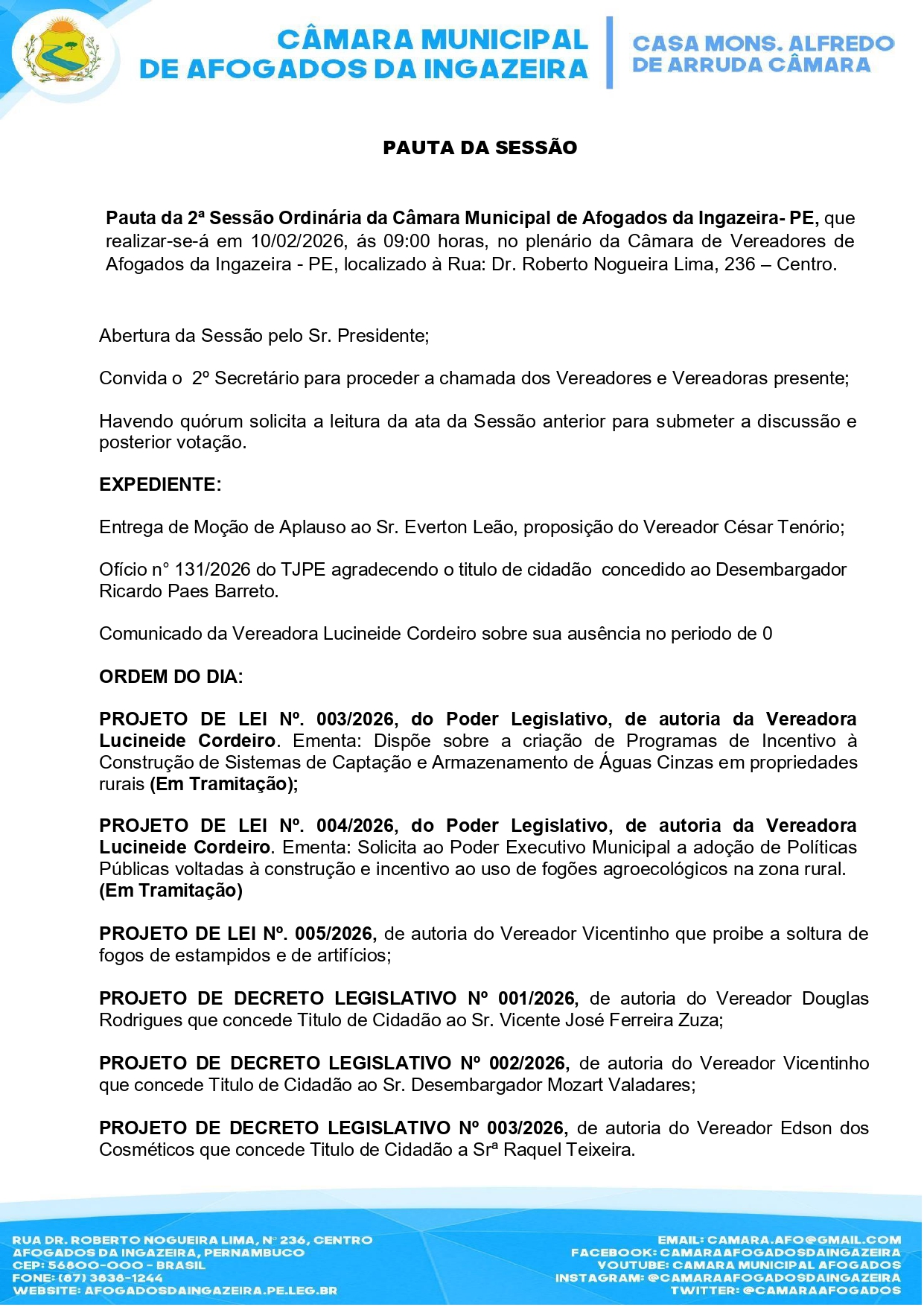 Na primeira Sessão Ordinária realizada em 03 de fevereiro de 2026, foram apresentados 38 requerimentos, 04 projetos de Lei do Poder Legislativo e 01 do Poder Executivo, numa demonstração de disposição dos Edis em interagir com a sociedade em geral.